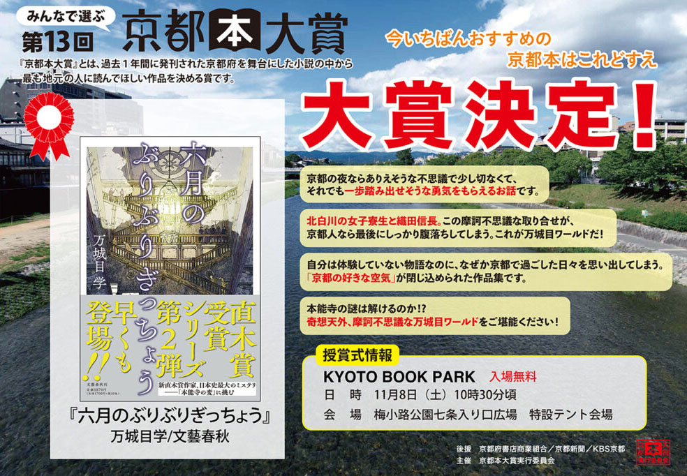 授賞式は11月8日「第13回京都本大賞」と共に開催予定です。